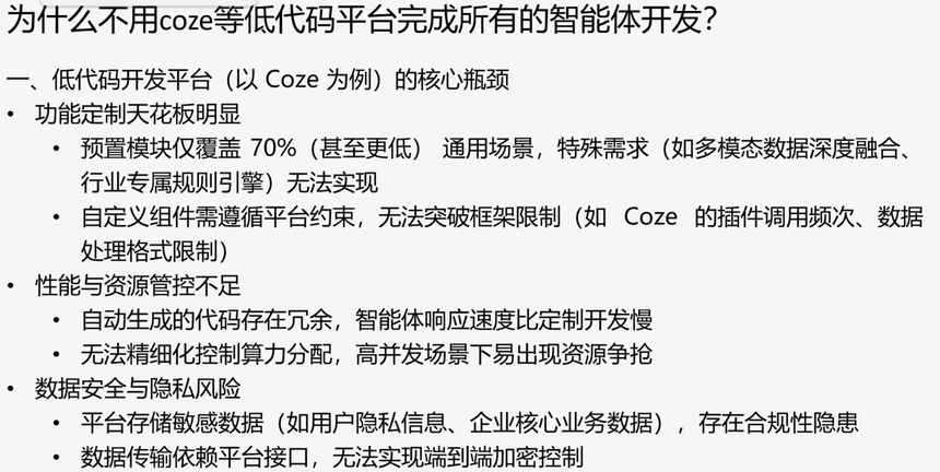 为什么不用coze等低代码平台完成所有的智能体开发?来看看老师的解释: